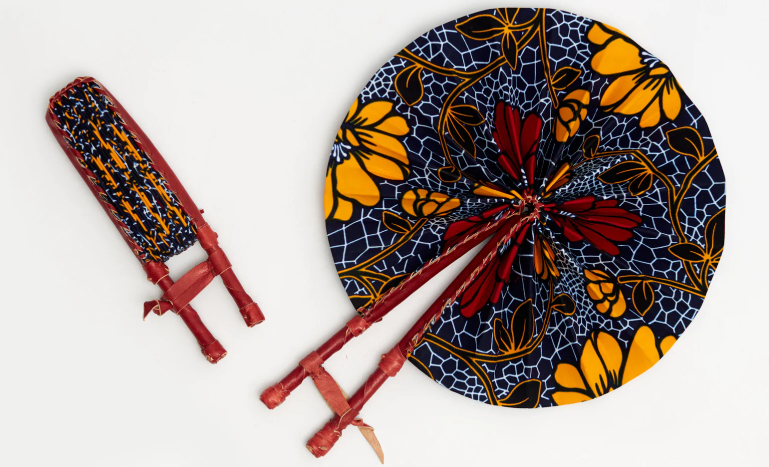 Beautiful hand-held fan made from colorful Ankara or African fabric crafted with genuine leather handles. Small and compact enough to fit into a purse when folded. When folded, size is approximately 12”x 2.5 and diameter when open is approximately 12”x 15”. Grab one to cool yourself down, or mix and match a few to create a beautiful accent wall. Perfect for gifting or party favors.