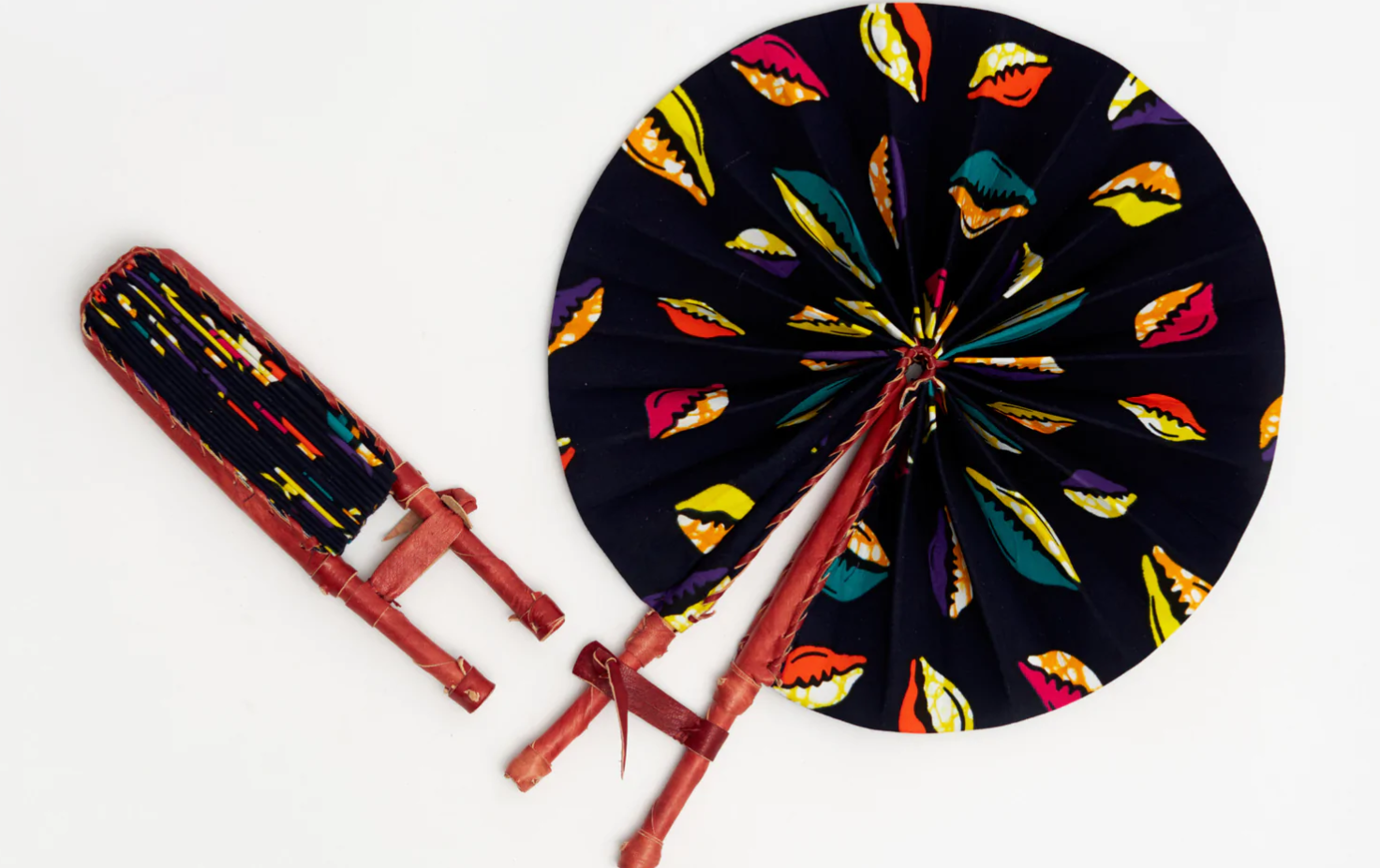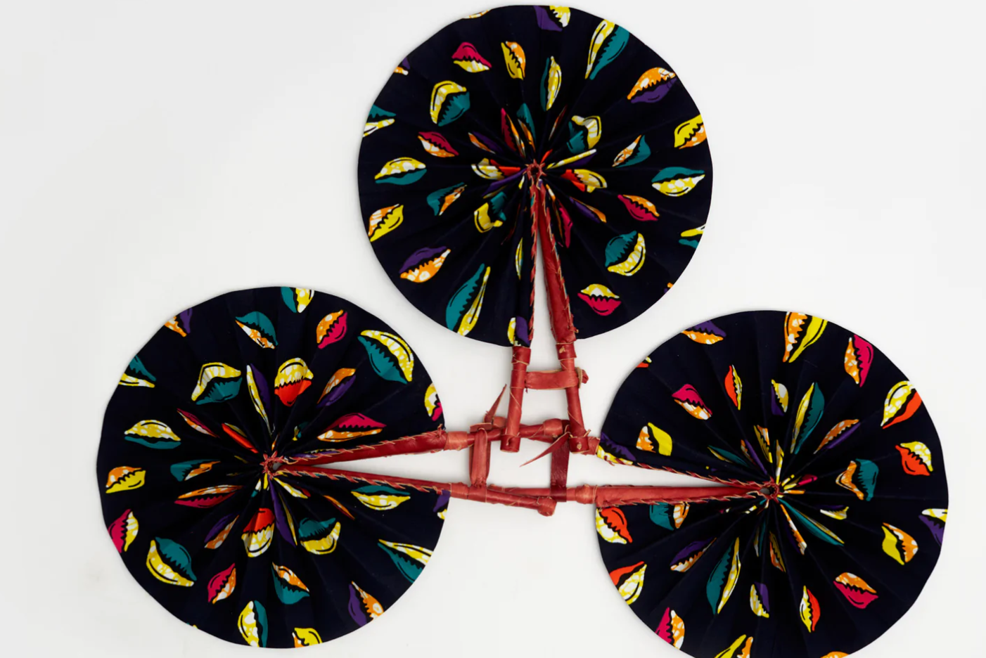 Beautiful hand-held fan made from colorful Ankara or African fabric crafted with genuine leather handles. Small and compact enough to fit into a purse when folded. When folded, size is approximately 12”x 2.5 and diameter when open is approximately 12”x 15”. Grab one to cool yourself down, or mix and match a few to create a beautiful accent wall. Perfect for gifting or party favors.