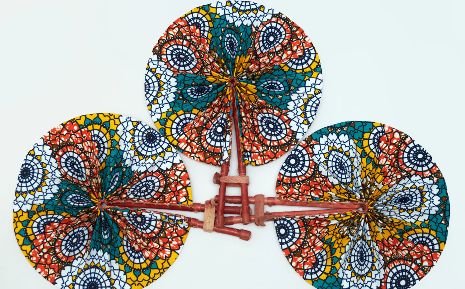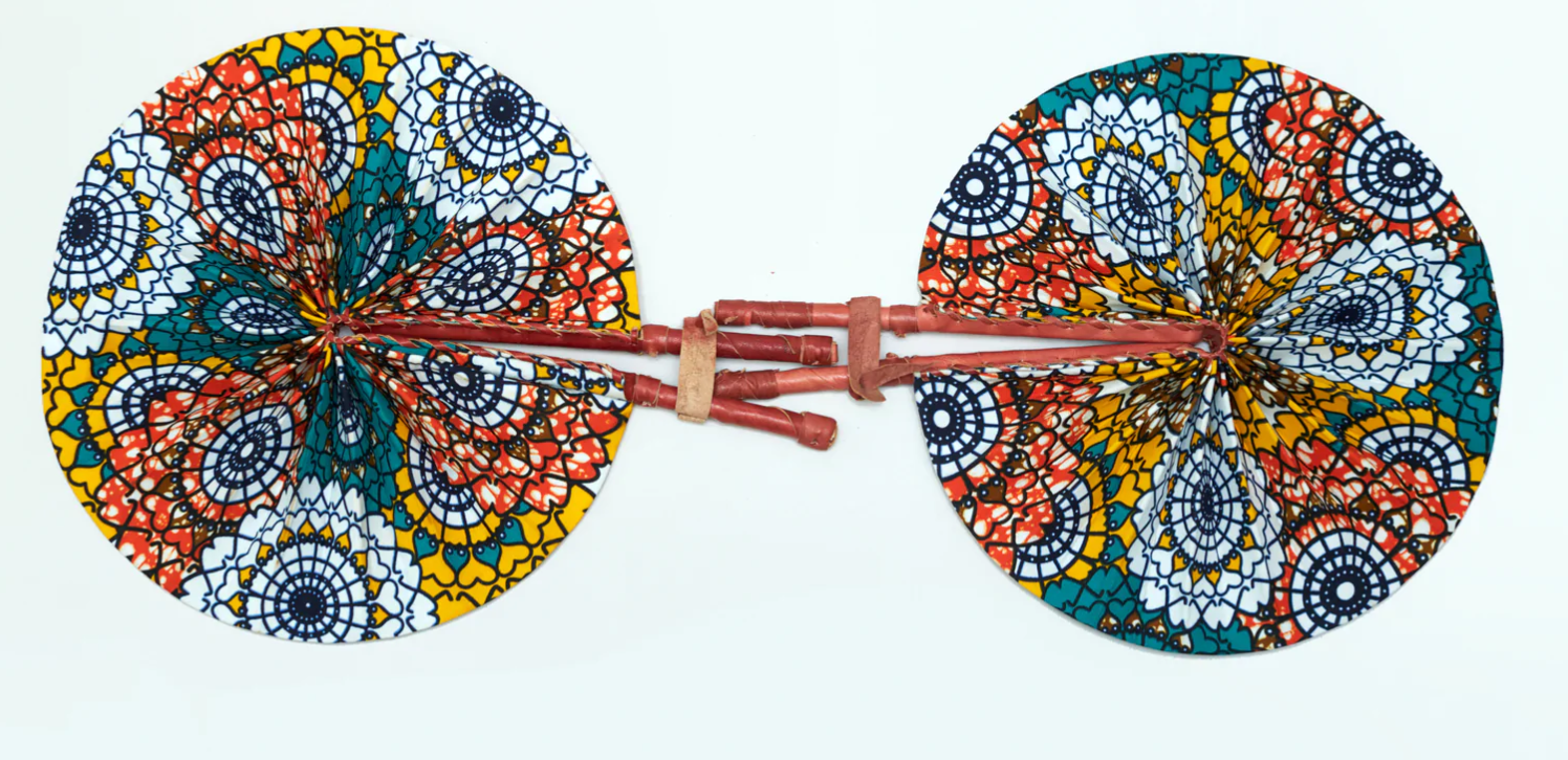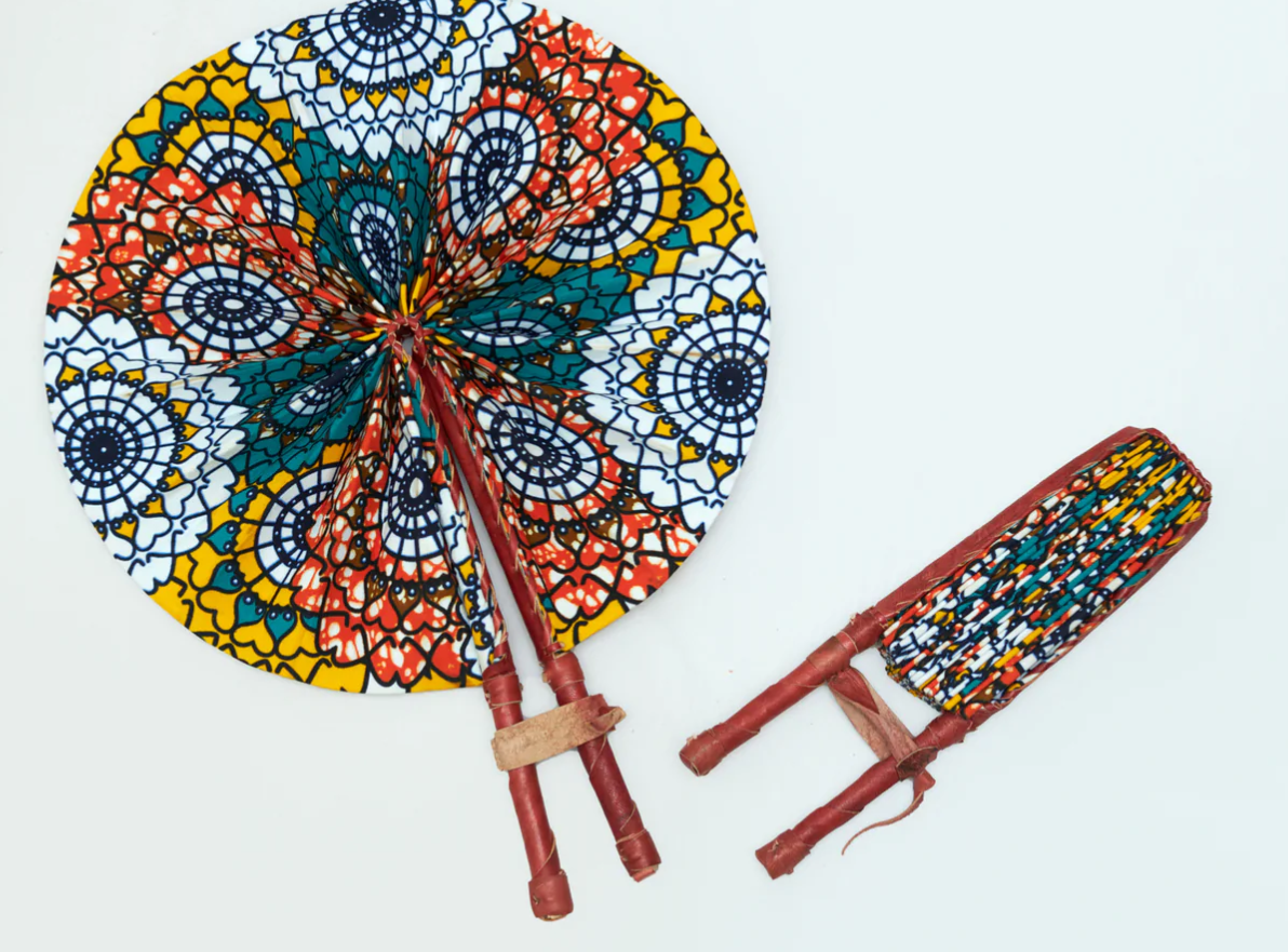 Beautiful hand-held fan made from colorful Ankara or African fabric crafted with genuine leather handles. Small and compact enough to fit into a purse when folded. When folded, size is approximately 12”x 2.5 and diameter when open is approximately 12”x 15”. Grab one to cool yourself down, or mix and match a few to create a beautiful accent wall. Perfect for gifting or party favors.