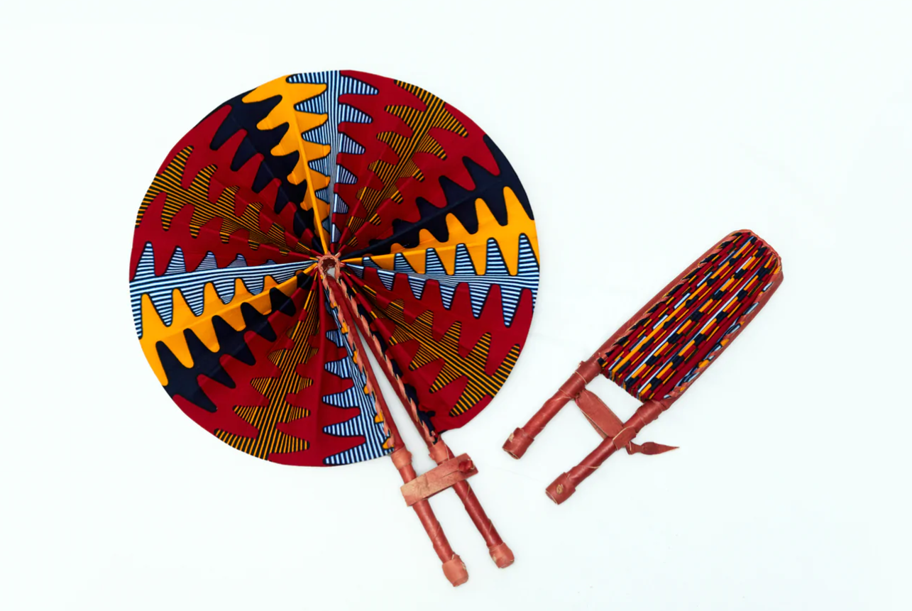 Beautiful hand-held fan made from colorful Ankara or African fabric crafted with genuine leather handles. Small and compact enough to fit into a purse when folded. When folded, size is approximately 12”x 2.5 and diameter when open is approximately 12”x 15”. Grab one to cool yourself down, or mix and match a few to create a beautiful accent wall. Perfect for gifting or party favors.